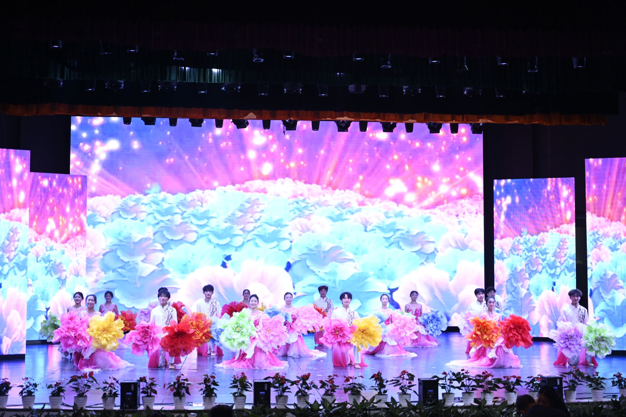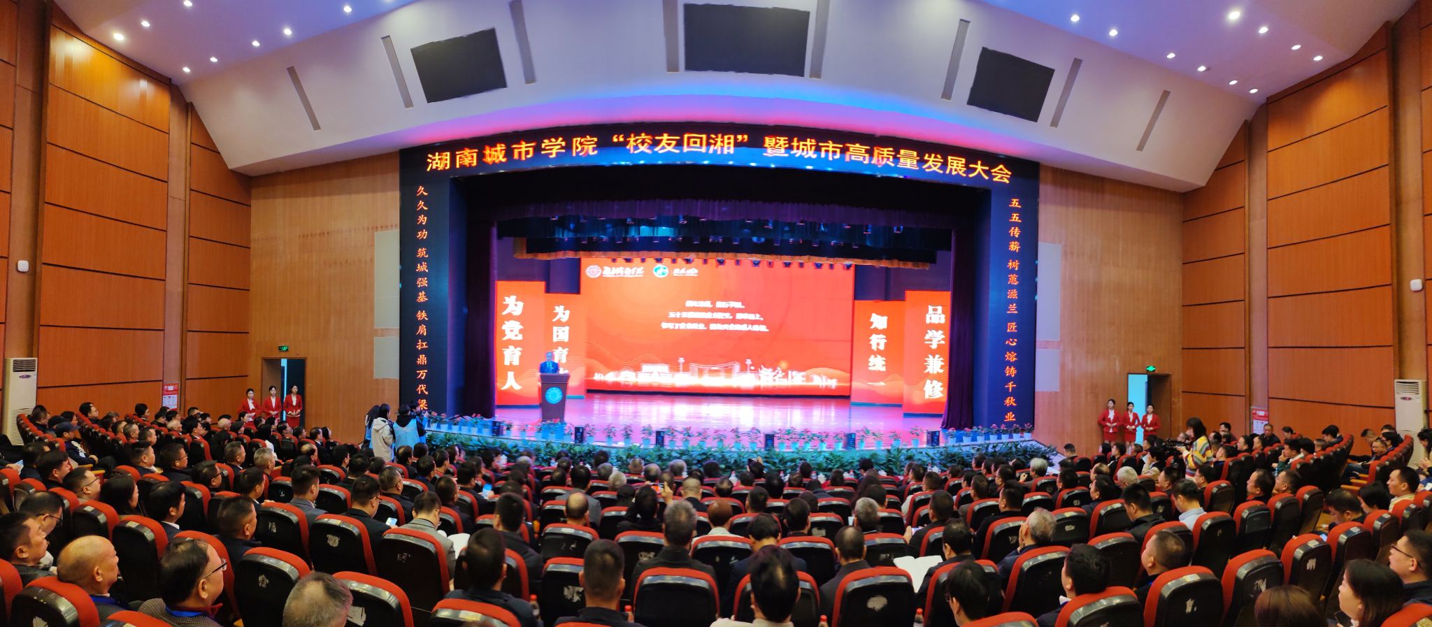 校园内彩旗高挂,巨大的宣传展板分外醒目,广大校友从大江南北回到魂牵梦萦的母校。学校音乐厅内洋溢着欢庆祥和的浓厚氛围,悠扬的音乐不绝于耳,璀璨的灯光交相辉映,大屏幕循环播放学校办学55周年主题宣传片《城市之光》,舞台两侧“五五传薪 树蕙滋兰 匠心熔铸千秋业”“久久为功 筑城强基 铁肩扛鼎万代梁”的对联异常显眼。四百余名校友、嘉宾、师生代表齐聚一堂,共同见证时博体育_时博(中国)办学55周年的荣耀时刻。