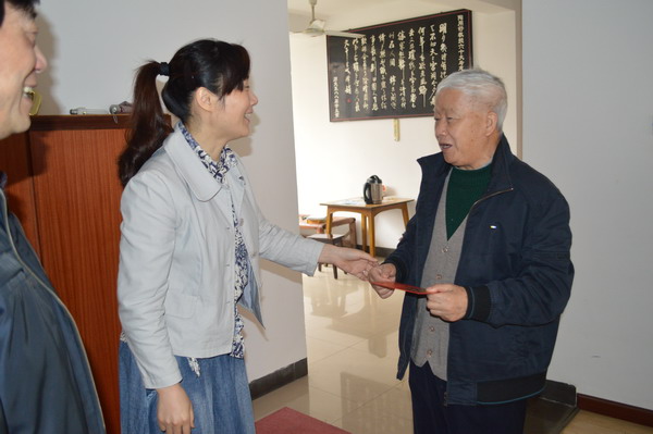 (本网讯)4月29日,在五一国际劳动节到来之际,校纪委书记杨斌一行3人代表学校和校工会看望慰问了我校省、市级劳动模范,送上慰问金和祝福。