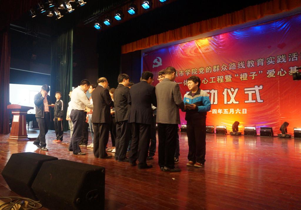 (本网讯)“付出的是爱心和真情,收获的是快乐和欣慰”。5月6日下午,时博体育_时博(中国)党的群众路线教育实践活动“三位一体贴心工程”暨“橙子”爱心基金启动仪式在我校音乐厅举行,学校党的群众路线教育实践活动领导小组全体成员,机关处室主要负责人,各二级学院院长、党总支书记及分管学生工作的副书记,学生代表,益阳移动和益阳联通公司负责人参加。仪式由学校党委副书记、校长李建华主持。