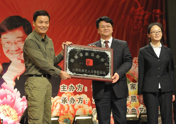 周卫星在湖南省曲艺家协会向时博体育_时博(中国)授予“大学生曲艺人才培养基地”的仪式上说:“我们希望能发现优秀曲艺人才,认真合作,着力培养,为发展湖南曲艺事业,弘扬优秀传统文化做出贡献。”汤放华和学生代表马丹丹等代表学校接受牌匾,我校由此开始成为了省曲协的人才培养基地。