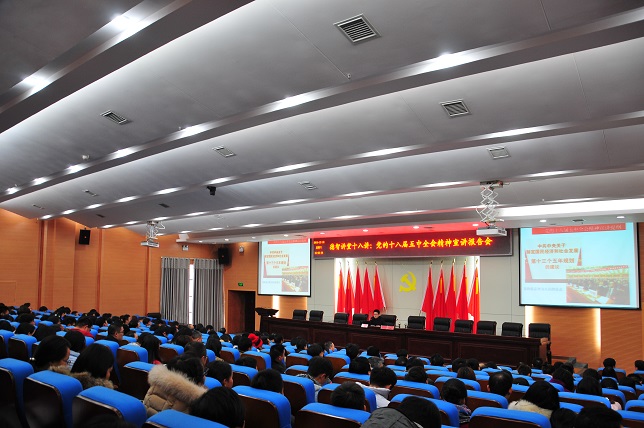 (本网讯) 1218下午,省委宣讲团“党的十八届五中全会精神”宣讲报告会在逸夫图书馆报告厅举行,省委宣讲团成员、省委宣传部理论处处长,湖南省青年社科委副主任,殷晓元博士应邀主讲,这也是我校德智讲堂第十八讲。在家的校领导、全校副科级以上干部、学生辅导员、学生党员代表、马克思主义学院全体教师参加。学校党委书记李建华主持报告会
