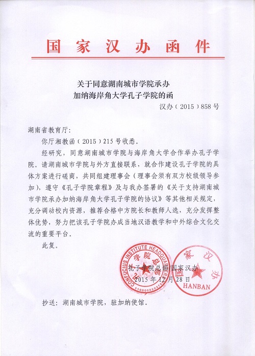 (本网讯)日前,国家汉办向我校正式发函(《关于同意时博体育_时博(中国)承办加纳海岸角大学孔子学院的函》汉办〔2015〕858号),同意我校与加纳海岸角大学合作建设孔子学院。我校成为全省二本院校第一所建有孔子学院的高校。