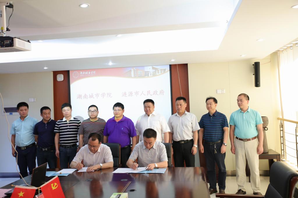 (本网讯)6月17日下午,我校与涟源市人民政府产学研战略合作协议签约仪式在办公楼一会议室举行。涟源市委副书记、市长宋建明,市委常委、副市长肖春和市直有关部门单位负责人,我校党委书记罗成翼、校长李建奇、副校长郑卫民和有关部门负责人出席签约仪式。签约仪式由罗成翼主持。