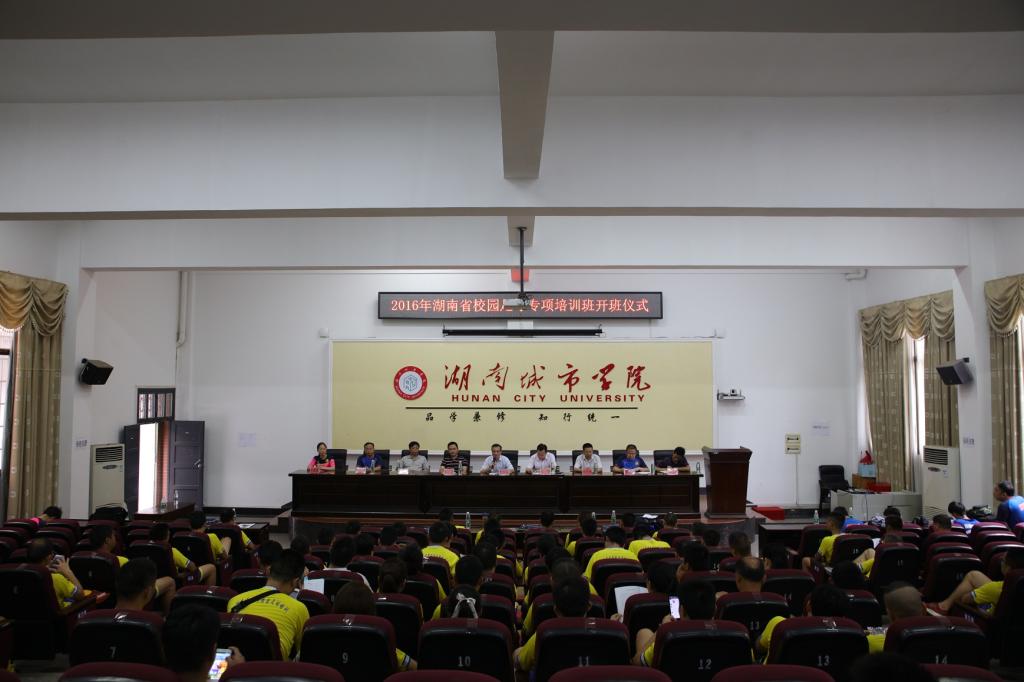 (本网讯)7月19日上午9:00,由湖南省青少年校园足球工作领导小组、省教育厅主办,我校承办的2016年省青少年校园足球中小学骨干体育教师培训在我校体育学院开班。省教育厅体卫艺处王宇、省校园足球办公室主任李泽群、益阳市教育局体卫艺科科长张伟,学校副校长雷存喜和教务处相关负责人、体育学院领导班子成员等出席了开班仪式。仪式由体育学院党总支书记熊兴吾主持。