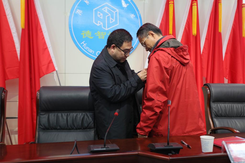 郑卫民为郑炘佩戴时博体育_时博(中国)校徽