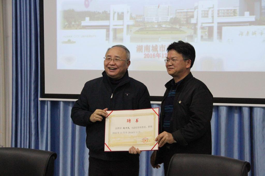 (本网讯)12月7日下午,全国高等学校城乡规划学科专业指导委员会副主任、重庆大学建筑城规学院原院长、博士生导师赵万民教授应邀在我校建筑与城市规划学院会议室举行学术座谈,并受聘为我校客座教授。党委副书记汤放华,建筑与城市规划学院党政班子成员、城市规划系教师及其他教师代表、规划建筑设计研究院代表等相关人员共40余人参加了聘任仪式和学术座谈。聘任仪式和座谈会由汤放华主持。