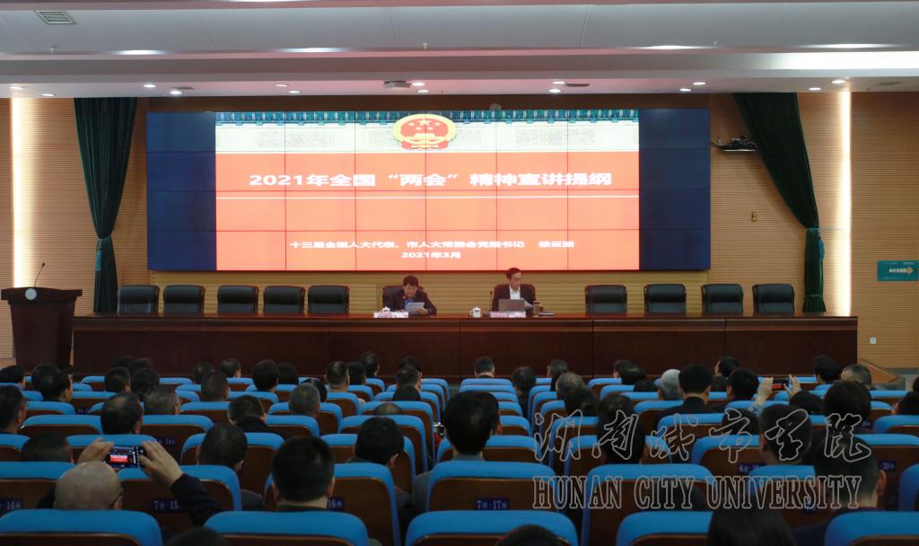 本网讯  2021年3月25日下午,我校在图书馆报告厅举行2021年度党委理论学习中心组(扩大)第三次集体学习。第十三届全国人大代表,益阳市人大常委会党组书记、常务副主任徐云波应邀来校作2021年全国“两会”精神宣讲。全体校领导、全体副处(含)以上干部、党支部书记、学生辅导员参加会议。宣讲会由党委书记罗成翼主持。