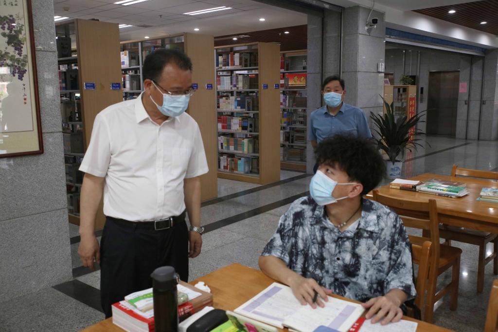 党委书记李建奇在图书馆了解学生学习情况。