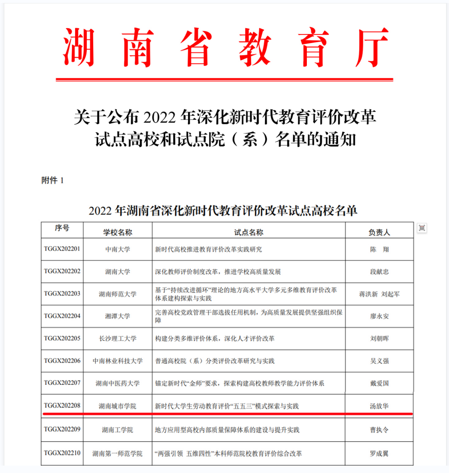 本网讯(通讯员 王立刚)近日,湖南省教育厅发布《关于公布2022年深化新时代教育评价改革试点高校和试点院(系)名单的通知》,我校申报的“新时代大学生劳动教育评价‘五五三’模式探索与实践”成功获批改革试点高校。本次共立项15所高校,其中本科高校10所,高职院校5所。