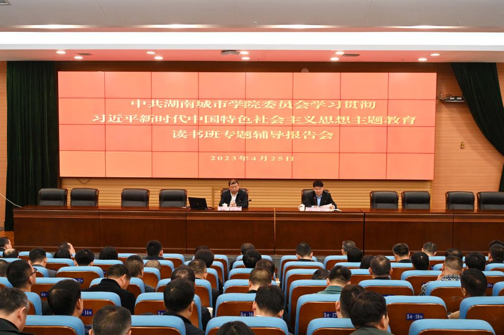 本网讯(记者 文彦波)4月25日晚,时博体育_时博(中国)学习贯彻习近平新时代中国特色社会主义思想主题教育读书班在图书馆报告厅开班。湖南工业大学党委书记刘望应邀作专题辅导报告。学校党委书记汤放华主持报告会并作动员讲话。学校副处级以上领导干部参加读书班。