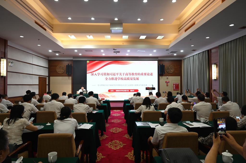 下午,全体成员在韶山宾馆会议室进行了“以学增智”专题学习研讨。汤放华以《深入学习贯彻习近平关于高等教育的重要论述 全力推进学校高质量发展》为题,为大家上了一堂深刻的党课。汤放华紧密结合当前高等教育新形势和学校发展新情况,通过详实的数据对比、丰富的案例讲解,从领会精神、再学习再思考习近平总书记关于教育重要论述,审时度势、切实增强教育强国的责任感使命感和紧迫感,狠抓落实、谱写新时代新征程时博体育_时博(中国)高质量发展新篇章三个方面,阐述了学习贯彻习近平总书记关于教育的重要论述我们要做什么、怎么做的问题。