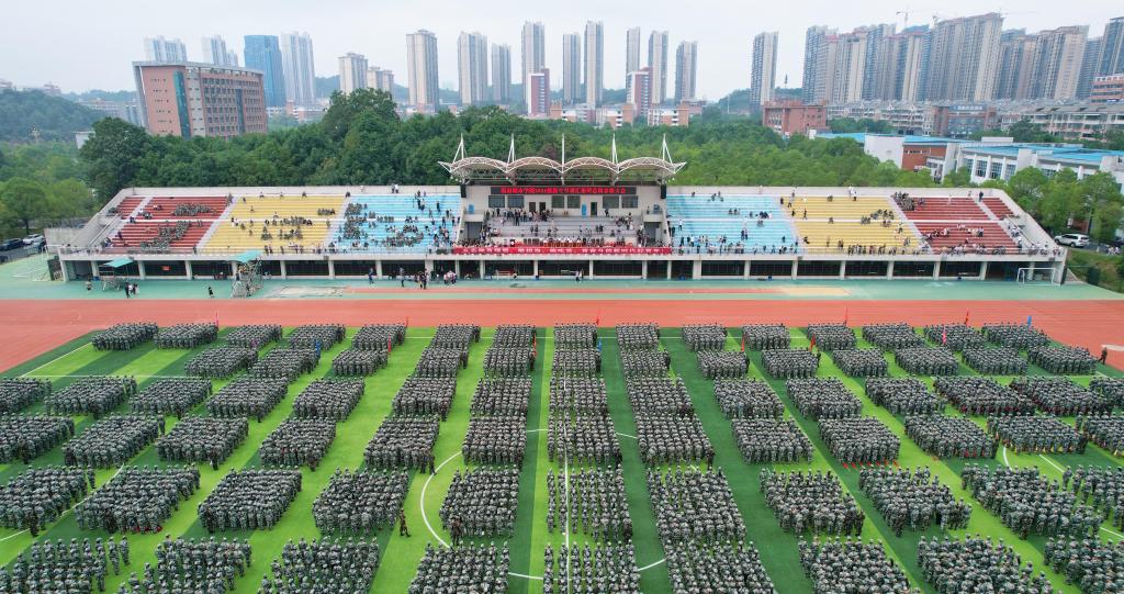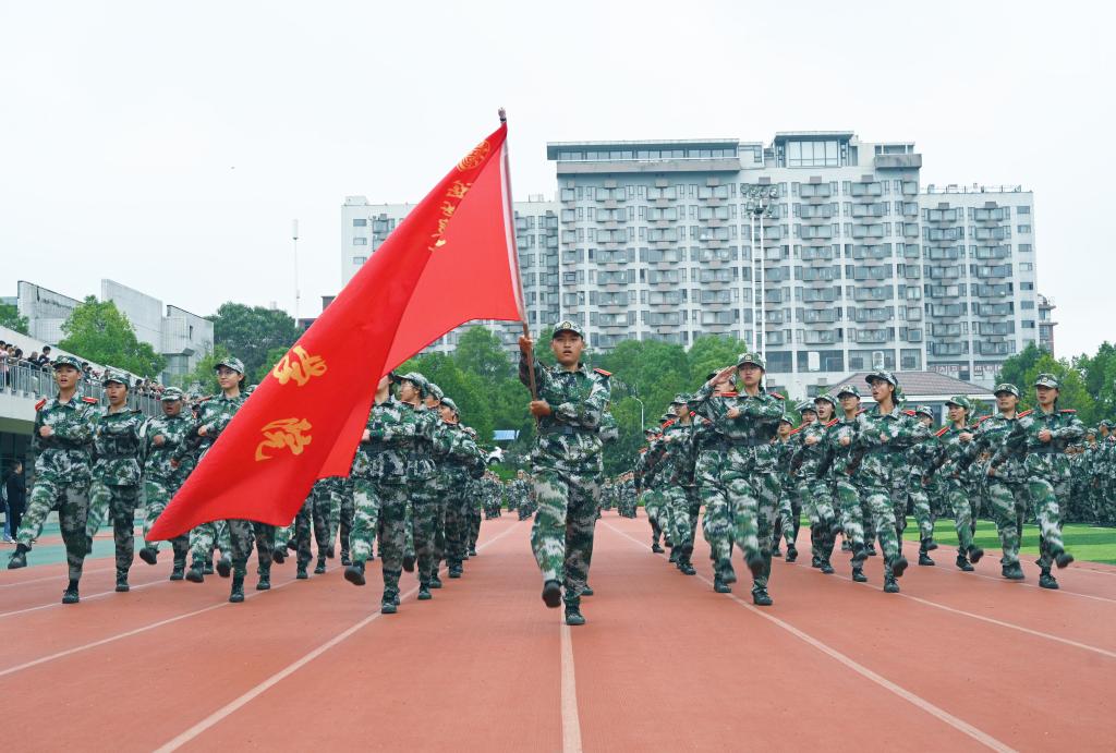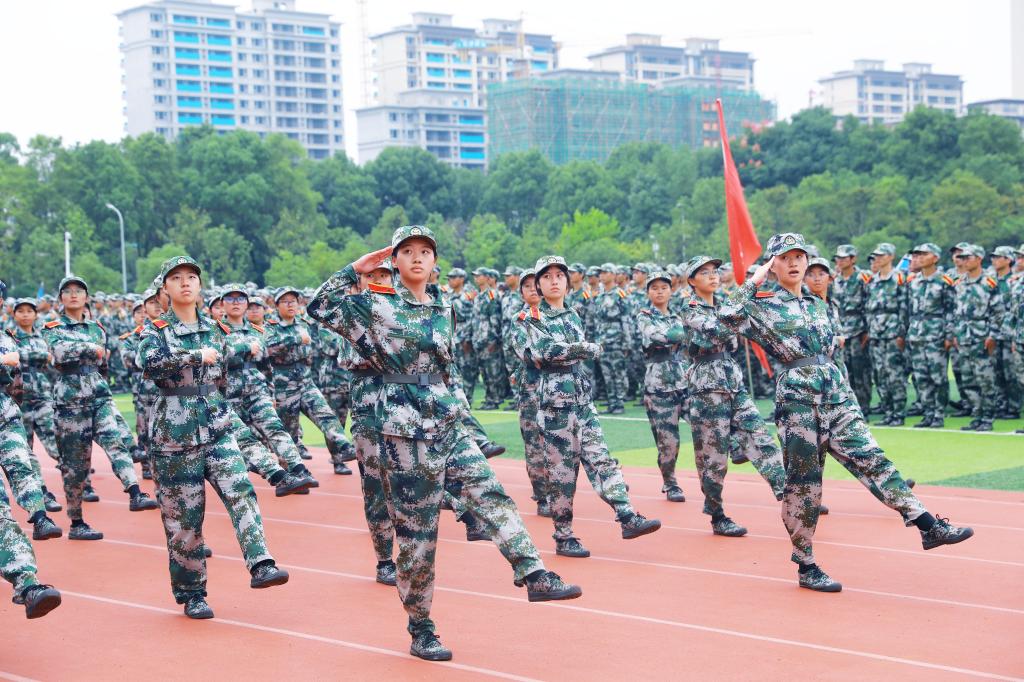 分列式进行曲响彻全场,教官分队持枪入场,眼神坚毅。他们以豪迈的激情斗志、过硬的军事素养向全校师生展现昂扬奋发、勇敢坚毅的精神风貌和青春风采。十三个二级学院方阵紧随其后,身着戎装的新生喊着铿锵有力的口号,迈着整齐矫健的步伐,向全校师生展示军训成果,接受全场的检阅。