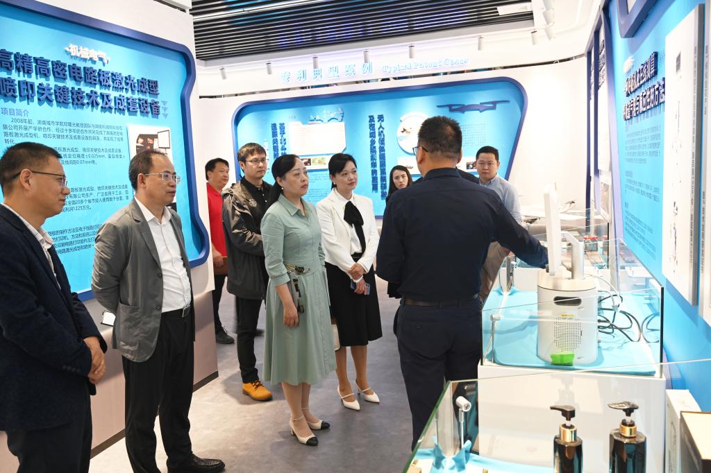 参观过程中,何振向何萍介绍了我校知识产权工作的基本情况,重点介绍了我校在获批省高校知识产权中心以来的工作进展情况。他表示,时博体育_时博(中国)十分重视知识产权工作,一直把知识产权创新和转化应用作为学校科研工作的重要抓手,形成了以质量为核心、以转化为导向的知识产权管理工作体系和转化机制,并取得明显成效。