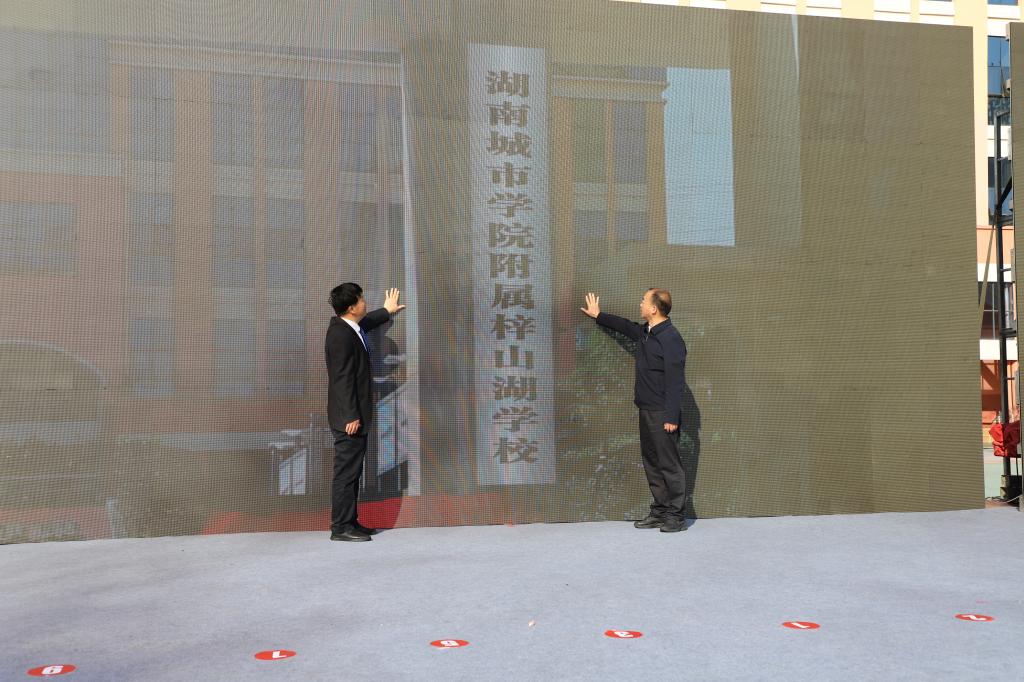 我校党委书记汤放华、赫山区区委书记周卫星为时博体育_时博(中国)附属梓山湖学校揭牌。
