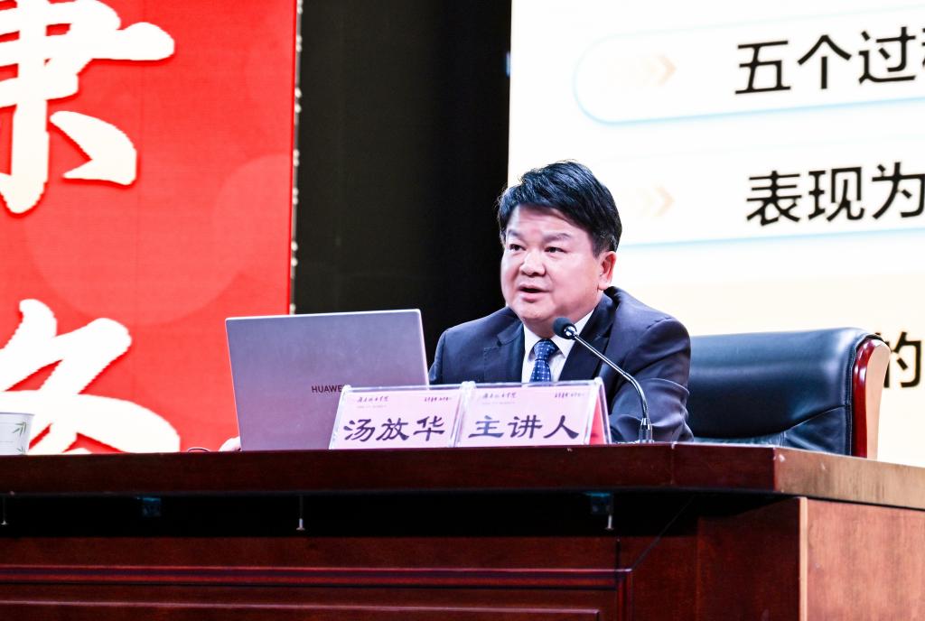 汤放华从“什么是中国式现代化”“如何走好走稳中国式现代化道路”“高质量发展引领中国式现代化”三个方面,深刻阐述了中国式现代化的历史逻辑、现实逻辑和实践逻辑。他指出,读懂中国式现代化就是要深刻理解中国式现代化的世界意义及看到未来发展机遇,中国式现代化是人口规模巨大的现代化,是全体人民共同富裕的现代化,是物质文明和精神文明相协调的现代化,是人与自然和谐共生的现代化,是走和平发展道路的现代化。