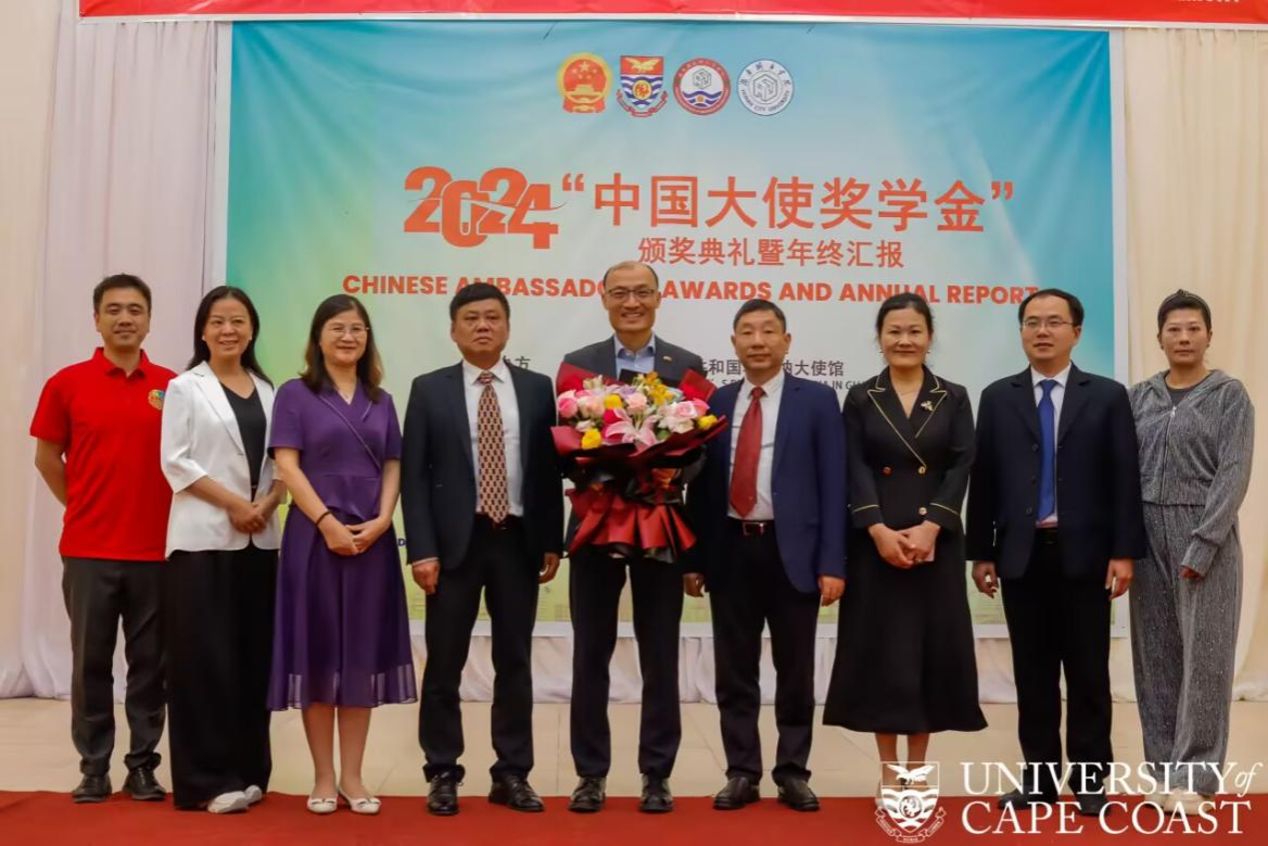 随后,代表团一行参加了2024海岸角大学孔子学院“中国大使奖学金”颁奖典礼,谭献良向中国驻加纳大使童德发及其他与会嘉宾简要介绍了我校发展概况以及孔子学院取得的成果。