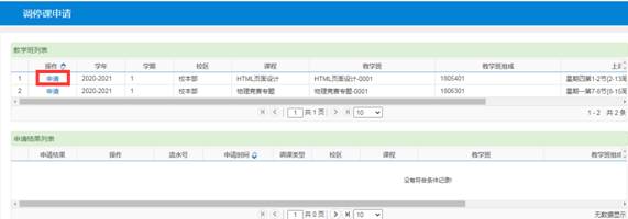 2、在调停课申请页面中点击教学班对应的【申请】链接,打开调停课申请窗口。