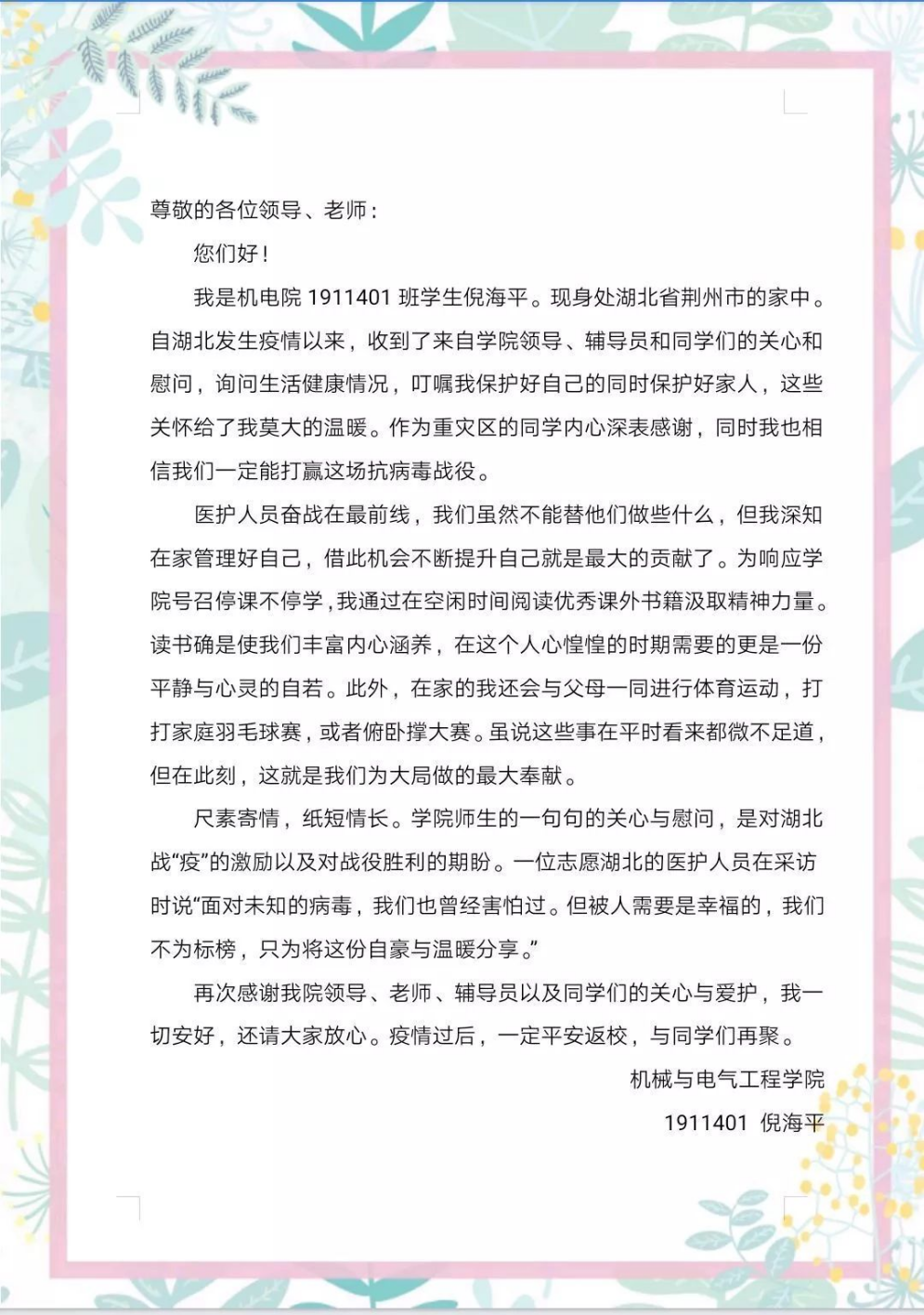 同心协力、英勇奋斗、共克时艰,2月13日,时博体育_时博(中国)机械与电气工程学院党总支书记徐畅贤、院长阳同光与学子紧密联系,并代表学院通过信件向身在抗击疫情前线的湖北籍学生送去学院的关怀和问侯。